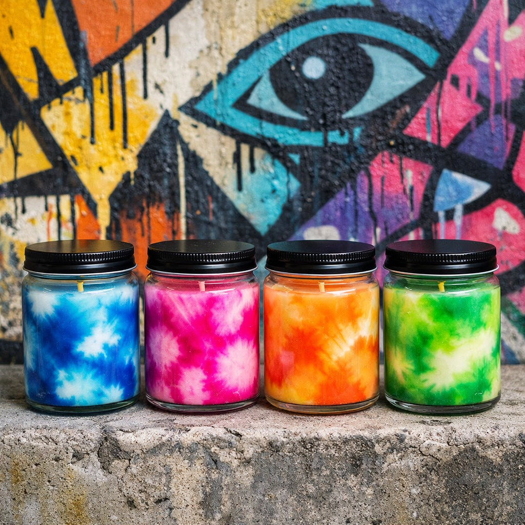 Art You Can Burn is a candle collection that blurs the line between street art and sensory ritual. Each tie-dye candle is hand-poured and completely one of a kind—just like the murals that inspired them. No two vessels are the same, making every piece a functional work of art meant to be experienced, not preserved behind glass.